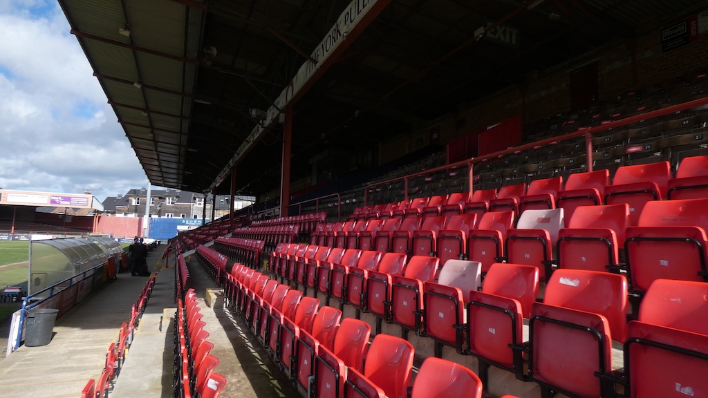 Eigenlijk was de ground gesloten vanwege een aankomende rugby-wedstrijd, maar we mochten van de vriendelijke bewaker toch even snel langs de “Main Stand” naar het veld lopen. Daar konden we ook de grote overhang bewonderen van de hoofdtribune, die verder elk moment uit elkaar leek te kunnen vallen.