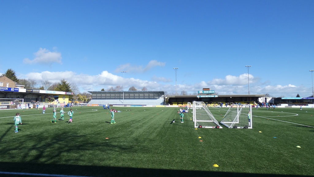 De hoofdtribune is een verplicht item in de National League, maar als je langer bent dan 160cm, heb je echt een probleem, want je kan je benen absoluut niet kwijt. Onder de hoofdtribune bevinden zich de kleedkamers. Je zou verwachten dat er twee relatief gelijke kleedkamers zijn, maar Trinity maakt een duidelijk verschil tussen de eigen kleedkamer en de kleedkamer van de gasten. Waar de thuiskleedkamer voorzien is van blauwe tinten op de muren, met foto’s van successen en succesteksten, is de andere kleedkamer een donker hol. De muren zijn grijs en somber; de bankjes zijn ongemakkelijk laag en de stopcontacten zijn afgeplakt met de tekst “out of order”, zodat de gasten hun telefoontjes niet kunnen opladen of hun favoriete muziek kunnen draaien. Op wedstrijddagen wordt de verwarming er lekker hoog gezet, zodat de spelers al vóór de wedstrijd oververhit zijn. Het lijkt wat flauw, maar ze trekken hier in ieder geval alles uit de kast om een wedstrijd te winnen. Navraag leerde trouwens dat het bij andere clubs ook wel gebeurd.
